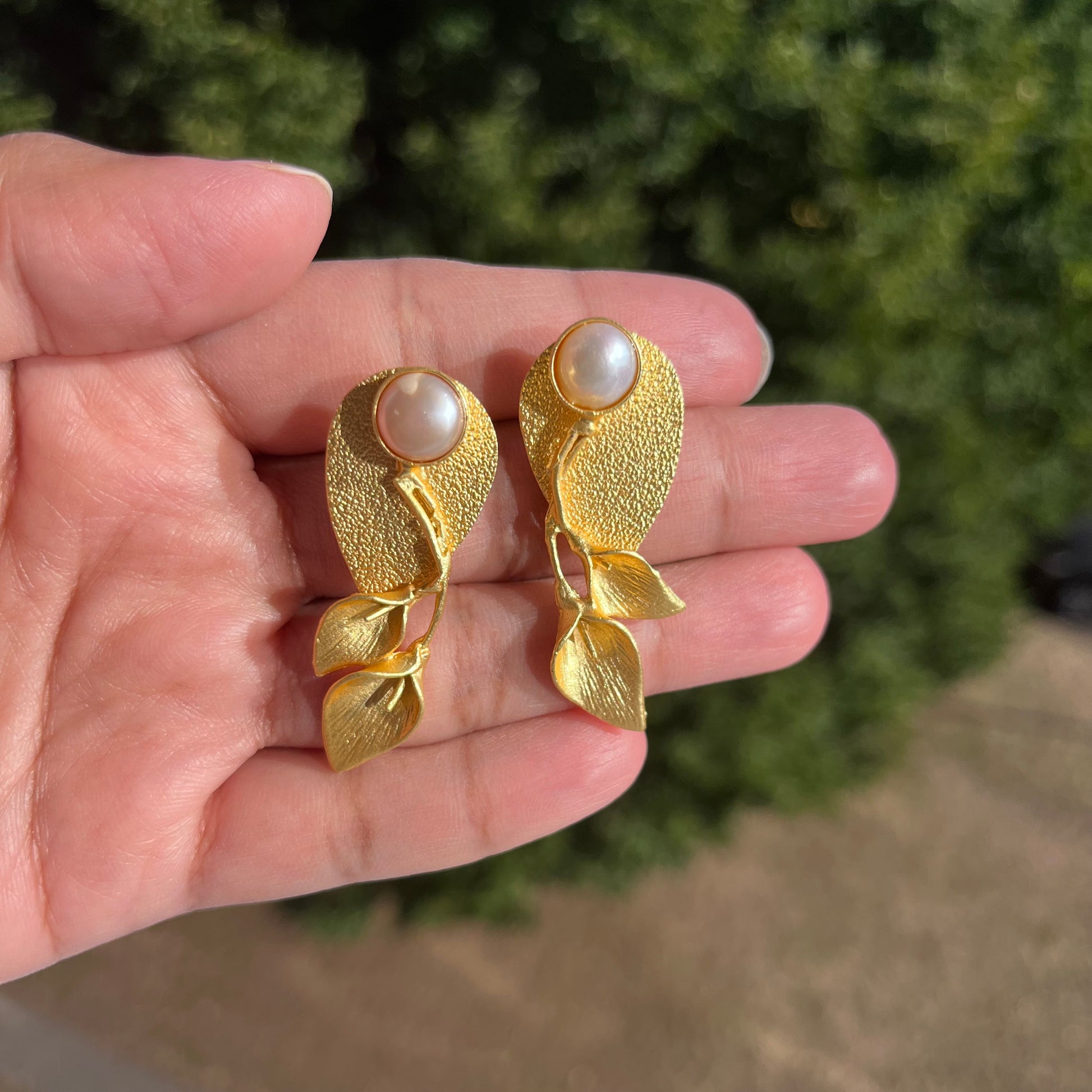 ✨ Inspired by nature’s elegance, these handmade brass earrings are finished in radiant gold plating and crowned with a luminous pearl. The textured oval base flows into delicate golden leaves, creating a design that feels organic, graceful, and timeless.